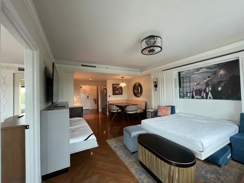 Accommodations range from tower studios for two to grand three-bedroom villas—each designed with a clean, modern aesthetic and thoughtful touches like soft textures, European-inspired lighting, and large windows. Villas include full kitchens, spacious living areas, in-room laundry, and private balconies with views of the gardens, lake, or fireworks. Tower studios, unique to Riviera, offer a compact and stylish stay with built-in storage, a queen-size pull-down bed, and floor-to-ceiling windows.